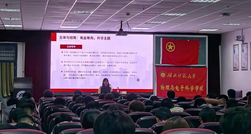 开班仪式在庄严的团歌声中拉开帷幕。全体学员面向团旗宣誓,展现了新时代青年坚定的理想信念与责任担当。经济管理与法学院团委书记徐科伟聚焦社会实践,从选题策划到成果转化进行全面指导;物理与电子科学学院团委副书记田学泽以“学团史、明团责、做合格共青团员”为主题开启首场讲座,系统梳理共青团的光辉历程,深入解读团员标准的时代内涵;美术学院团委副书记柳昌梅则立足宣传实务,通过正反案例对比生动解析写作排版技巧与宣传规范,形成理论教育、实践指导与技能培养三位一体的课程架构。