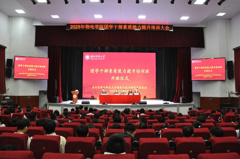 11月28日晚,物理与电子科学学院在湖师大礼堂举行团学干部素质能力提升培训班开班仪式。参与本次开班仪式的有学院党委书记孙丹娟,党委副书记刘雅,学工办老师仇奥、李可,团学干部及24、25级班干部代表。仪式由学院团委副书记田学泽主持。
