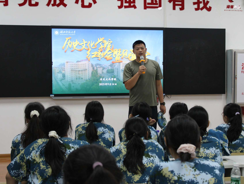 活动伊始,孙玉钟介绍了优秀退役大学生王宝同学的事迹,呼吁同学们坚定理想信念,勇担时代使命。在学唱《强军战歌》、《中国军魂》以及校歌《我们是光荣的湖师人》这一环节,同学们大声歌唱,以歌声表达对祖国的热爱、对军人的敬仰以及对校园的归属感。孙玉钟组织同学们观看历史影片片段,让同学们在革命先烈冲锋陷阵、英勇无畏的壮烈场景中,深刻感受到和平来之不易,进一步坚定了传承红色基因、赓续精神血脉的决心,新时代的青年更要勇于担当时代赋予的使命。