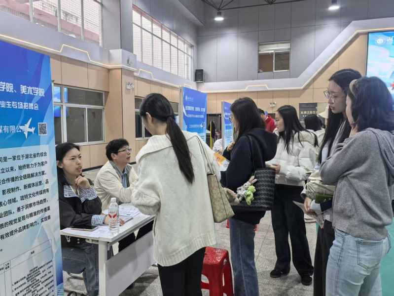 本次招聘会主打“分类指导、精准服务”,助力体艺学子奔赴职业新征程。招聘会聚焦体育、艺术、美术多学科融合就业方向,吸引了黄梅向日葵研学实践营地有限公司、深圳超级健身管理有限公司、湖北长江广电广告有限公司等11家省内外优质用人单位参会。其中,体育类岗位涵盖体育研学导师、健身教练等方向,舞蹈声乐器乐类、游戏美术设计、主播等岗位也为音美两院学生提供了广阔选择。整体岗位专业适配度高、发展前景广阔。体育学院毕业生持简历、专业资格证书及运动等级证书,与用人单位深入沟通了岗位职责、发展通道及薪资待遇等核心信息。体育学院党政负责人、毕业年级辅导员全程驻场,为体育生提供简历优化、面试指导等指导服务,并针对体育行业就业特点解答相关问题。用人单位普遍表示,我校体育学院毕业生专业基础扎实、综合素质过硬,在团队协作与执行力方面表现优异,期待吸纳更多优秀体育人才加入。